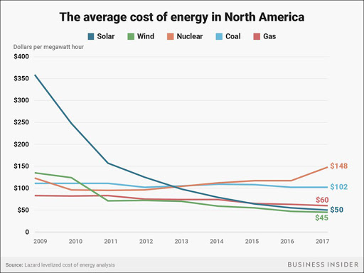Y esta tendencia sólo aumentará. Como vemos en este gráfico, las energías renovables ya son las fuentes más baratas de generación eléctrica, y si a esto le sumamos que la minería Bitcoin se mueve en un container, es cosa de tiempo hasta que gran parte de esta sea explicada por energías renovables.
