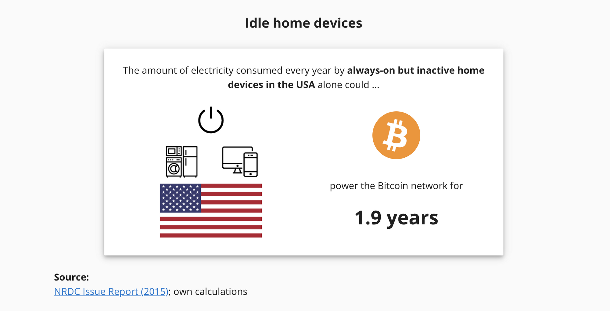 Sobretodo si consideramos que no tenemos ningún problema con que al año los electrodomésticos que están enchufados a la corriente, y no están siendo usados, o sea 100% ineficiencia, sólo en Estados Unidos consuman lo necesario para 1.9 redes Bitcoin.