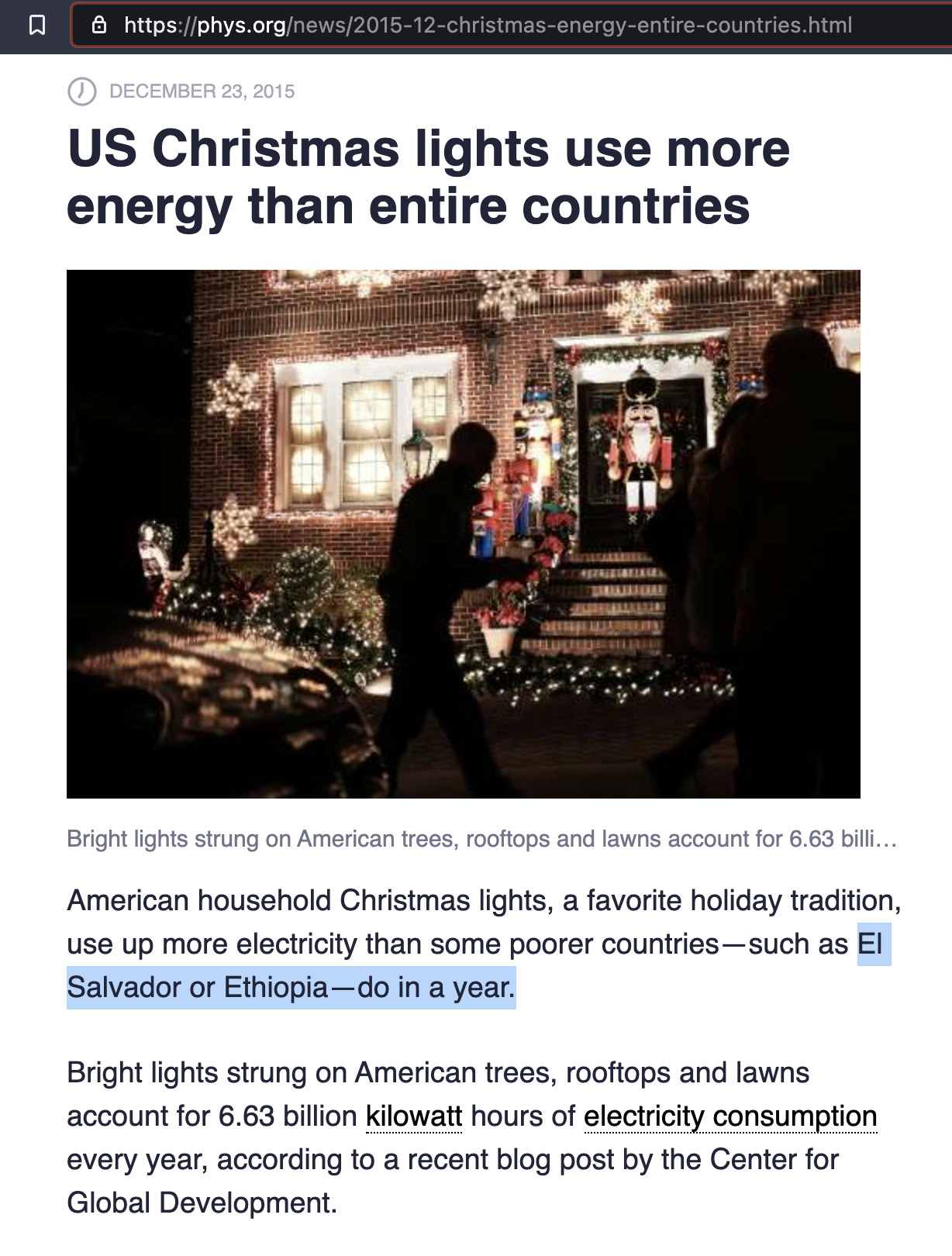 O, por ejemplo, ¿nos haremos cargo del hecho de que sólo en EEUU se consume más electricidad en luces de navidad que en países enteros en 1 año? Preferimos luces de colores en navidad o independencia financiera?