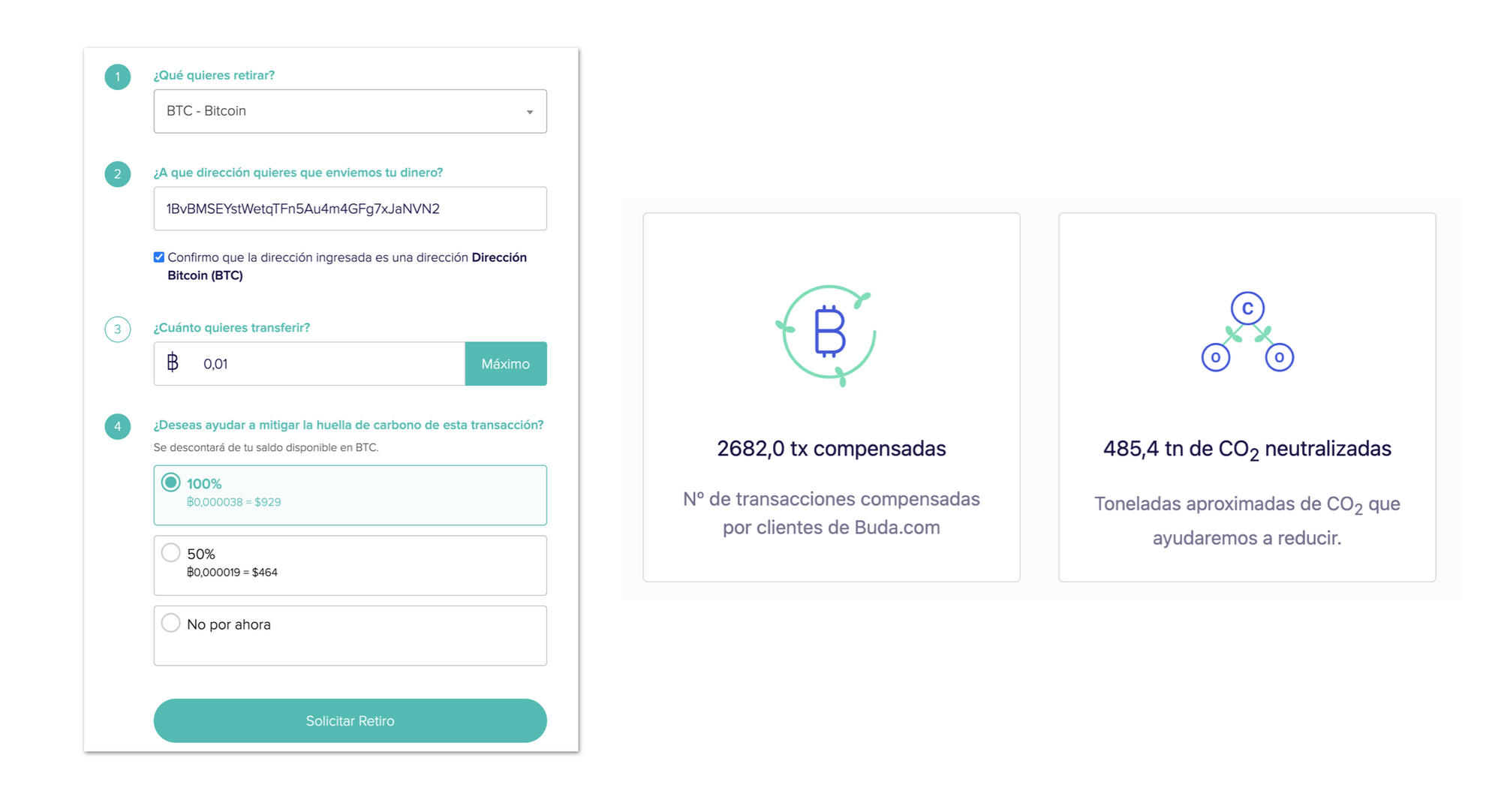 ¡Excelente! en Buda.com se puede compensar la huella de carbono asociado al retiro Bitcoin, al momento de retirar.