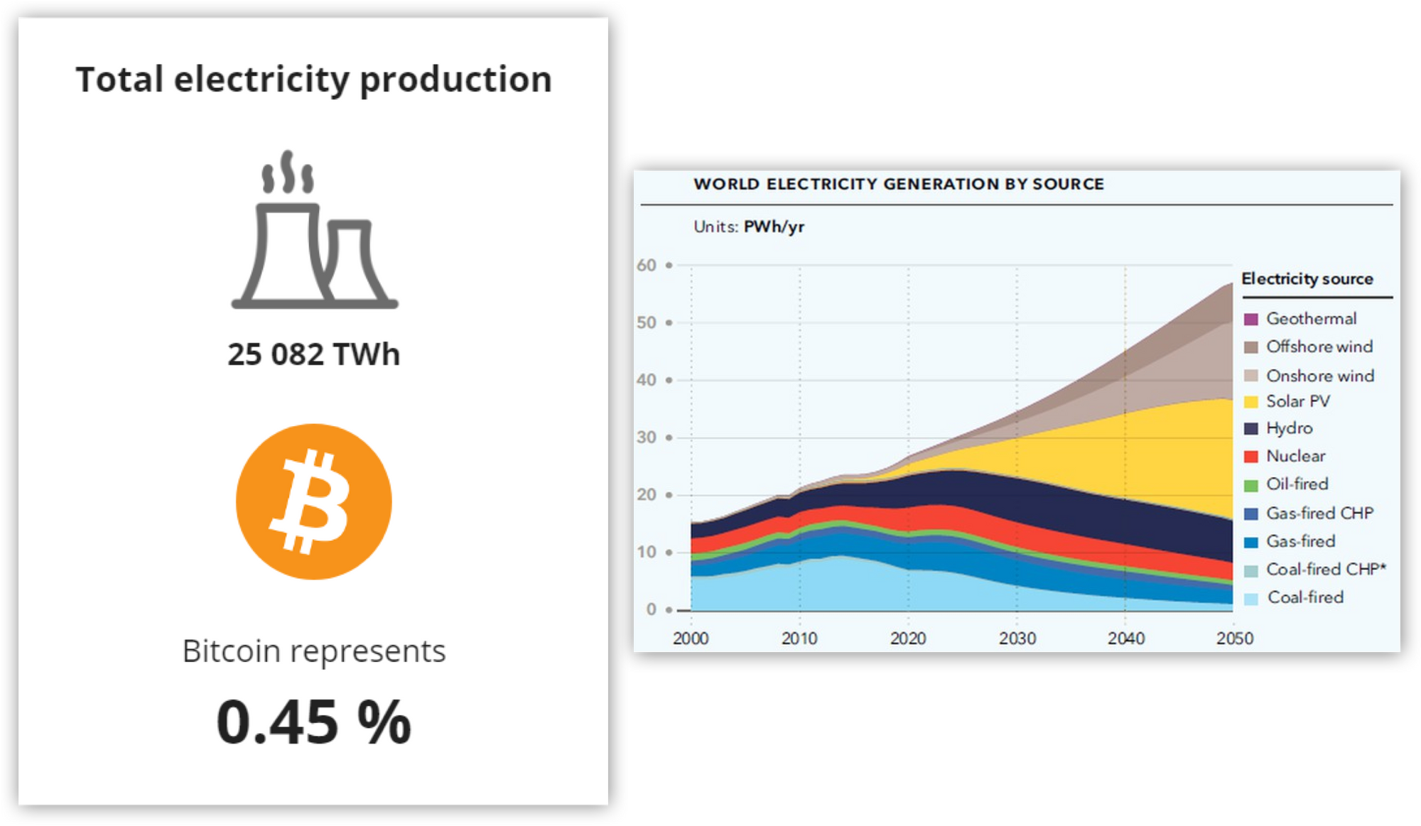 Bitcoin usa el 0.45% de la electricidad, o sea, 0.07% de la energía total producida por el mundo. Y la energía eléctrica es la más limpia de las tres, porque tanto para calentar y para transportar se usa casi exclusivamente combustibles fósiles, mientras que actualmente las energías renovables ya representan el 30% de la matriz de generación eléctrica global, y para el 2050 se espera que represente más del 70%.