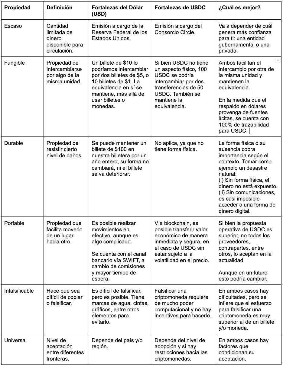 Para responder a esta pregunta, requerimos enfocarnos en algunas propiedades del dinero, las cuales se resumen en el siguiente cuadro: