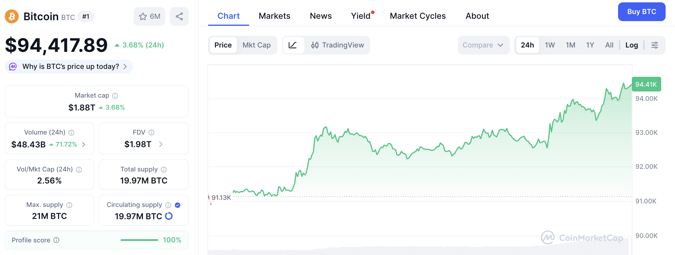 Bitcoin abrió la semana al centro de la escena: cotiza en torno a US$ 94.300, con un máximo intradía cercano a US$ 94.445 y mínimo en US$ 91.031. Es un avance ordenado tras los titulares geopolíticos del fin de semana, y confirma que, cuando el resto de los mercados está cerrado, cripto [que opera 24/7] suele dar la primera lectura de riesgo.
